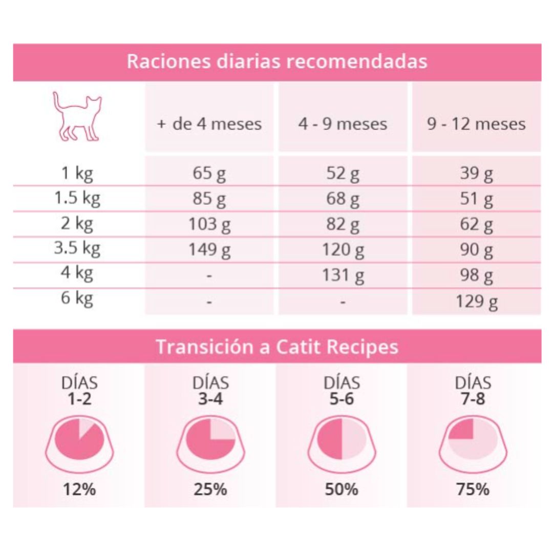 Catit Recipes Kitten es una receta formulada para apoyar el crecimiento y desarrollo temprano de tu gatito. Enriquecida con taurina, aceite de pescado, prebióticos y probióticos. Esta dieta promueve la salud cardiovascular y cerebral, a la vez que facilita la digestión.