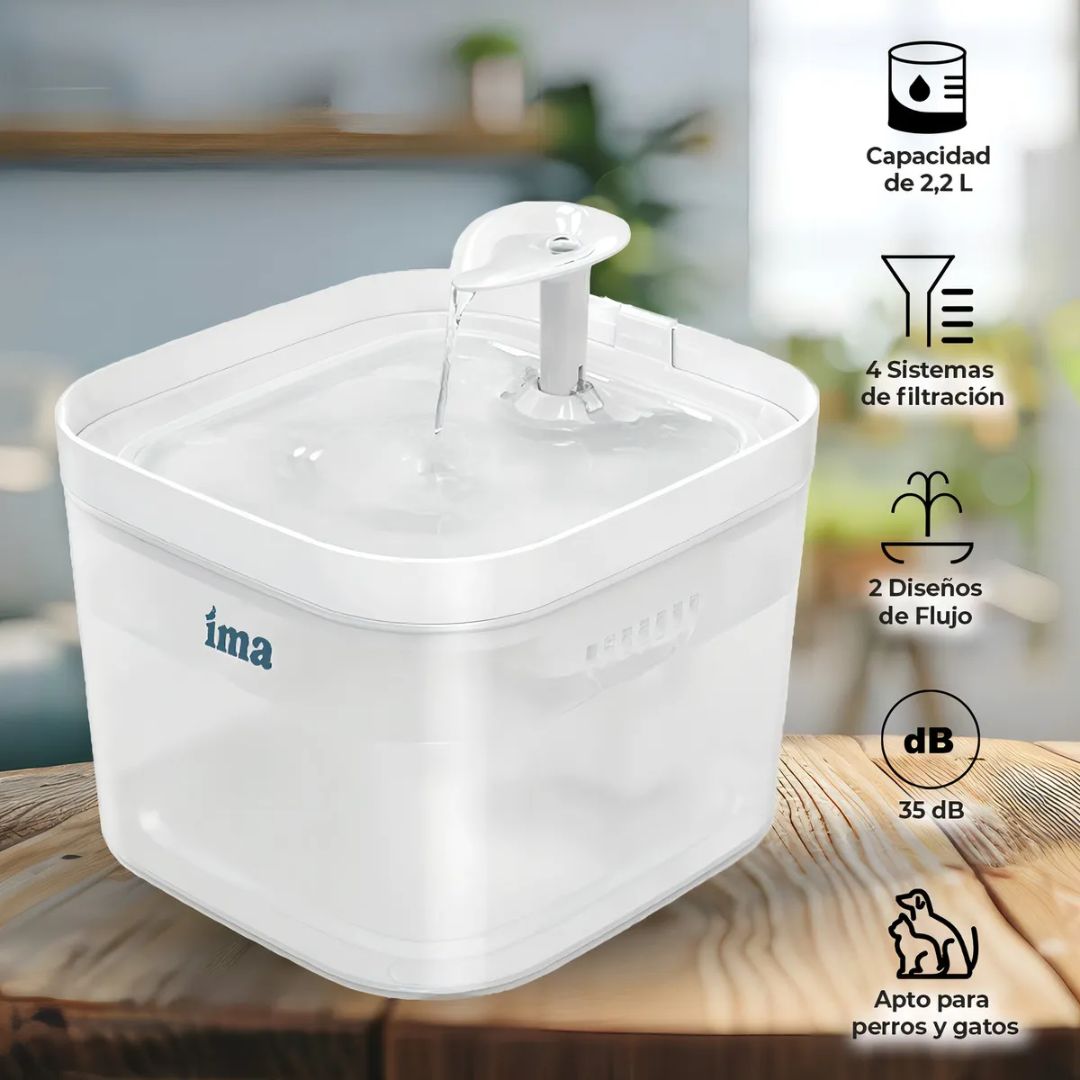 Fuente de agua automática IMA para perros y gatos pequeños y medianos, con capacidad de 2,2 litros, dos modos de flujo y filtrado de agua para hidratación segura.