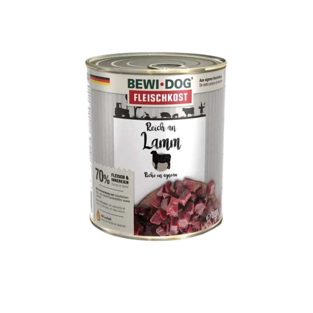 Lata BewiDog rico en cordero es un alimento húmedo para perros que contiene carne jugosa con una textura firme, justo como le gusta a los perros.