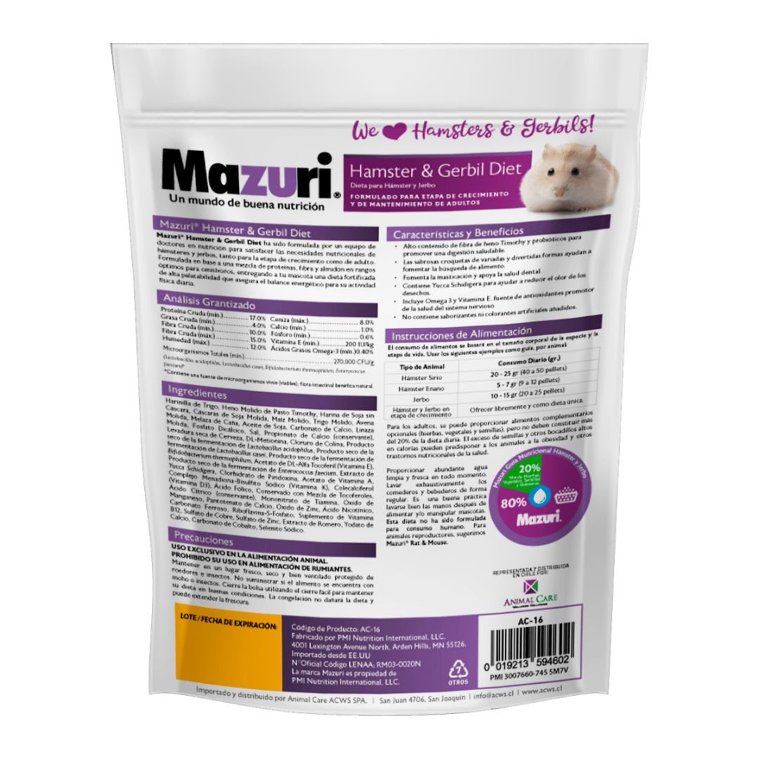 Mazuri Hamster & Gerbil Diet es una dieta completa y balanceada para hamsters y gerbos en todas sus etapas. Puede ser usado como única fuente de nutrientes y no requiere ningún tipo de suplemento alimenticio (vitaminas, minerales). Su formulación contiene sólo ingredientes vegetales premium. Sus fuentes de vitamina E y pigmentos son naturales (mayor poder biológico).
