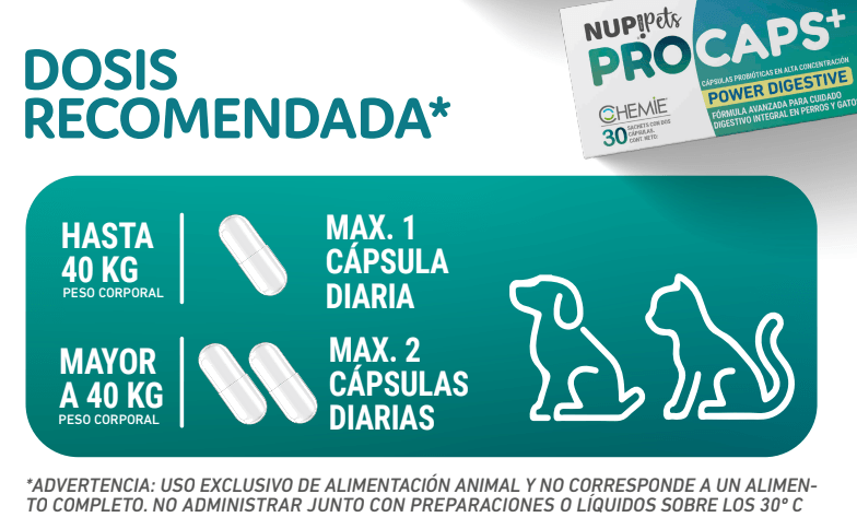 Modo de uso: Administrar 1 o 2 cápsulas al día (según dosis recomendada) por al menos 5 a 10 días. Introducir una cápsula directamente hacia la garganta del animal o abrir la cápsula y mezclar el contenido con un snack o alimento a temperatura ambiente. Consumo máximo: para perros y gatos de hasta 40 kg de peso corporal, administre máx. 1 cápsula al día. Para aquellos con un peso superior a 40 kg, máximo 2 cápsulas diarias.