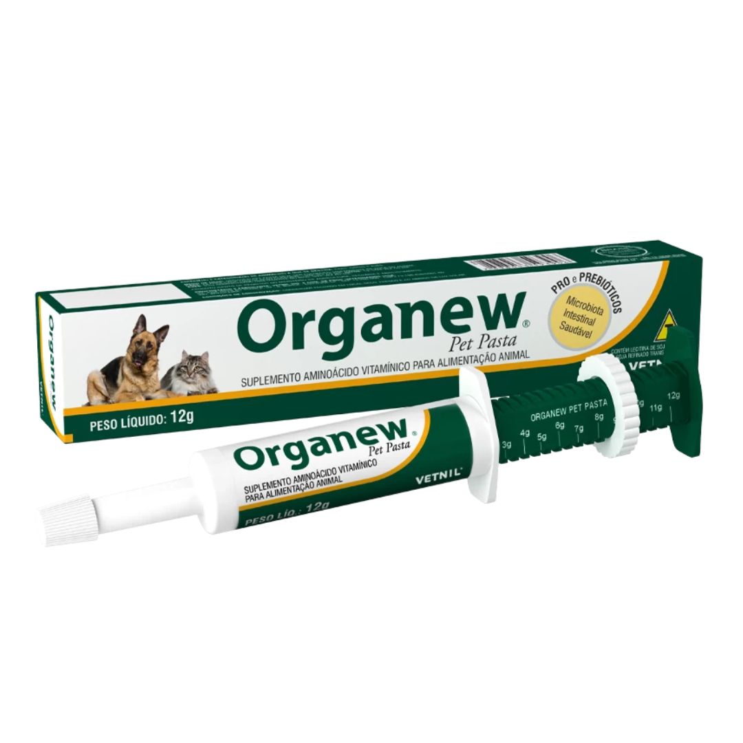 Organew Pet Pasta 12 gr es compuesto por vitaminas, minerales, aminoácidos y elementos pro y prebióticos para ayudar en el desarrollo y mantenimiento de una microbiota intestinal sana, contribuyendo con la mejora de la digestibilidad de los nutrientes de la dieta y el aumento de la eficiencia alimentaria.