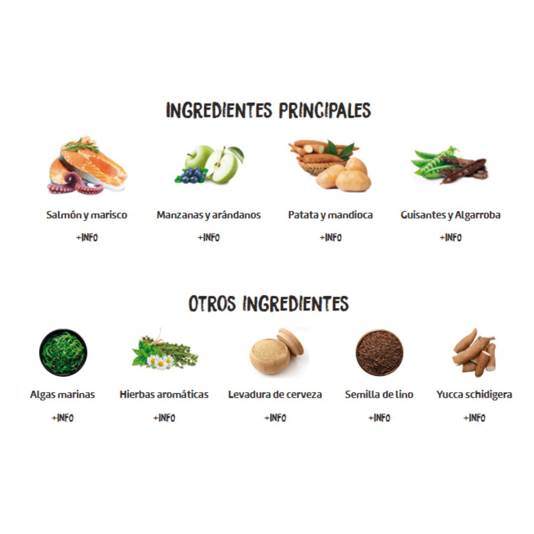 Pescado 37% (salmón fresco* mín. 10% antes de la extrusión, marisco fresco* mín. 10% antes de la extrusión, hidrolizado de salmón 10% y salmón deshidratado 7%), pollo deshidratado (28%), guisantes enteros* (10%), grasa avícola (preservada con antioxidantes naturales), raíces de mandioca* (5%), vaina de algarroba* (3%), patata deshidratada* (3%), proteína hidrolizada de pollo, pulpa de remolacha, levadura de cerveza* (1%), manzana* (1%), semilla de lino* (1%), sal gema*, aceite de salmón (preservado con antioxidantes naturales), fructo y manano oligosacáridos, alfalfa deshidratada*, algas marinas deshidratadas* (500 mg/kg), glucosamina (500 mg/kg), yucca schidigera, condroitín sulfato (100 mg/kg), arándanos* (100 mg/kg), tomillo* (80 mg/kg), flor de manzanilla* (80 mg/kg), hinojo* (80 mg/kg), equinácea* (80 mg/kg), té verde* (80 mg/kg).*INGREDIENTES NATURALES