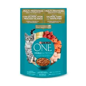 Agua suficiente para proceso, carne de pescado blanco, carne de pollo, gluten de trigo, carne de pavo, hígado de cerdo, almidón de maíz modificado, carne de atún, harina de soya, concentrado de proteína de soya, fosfato de calcio, colorante (dióxido de titanio), cloruro de potasio, taurina, cloruro de colina, sal, mononitrato de tiamina, suplemento de vitamina E, sulfato de zinc, sulfato ferroso, niacina, pantotenato de calcio, suplemento de vitamina A, complejo sódico de bisulfito de menadiona (fuente de actividad de vitamina K), sulfato de cobre, sulfato de manganeso, hidrocloruro de piridoxina, suplemento de riboflavina, suplemento de vitamina B-12, biotina, acido fólico, suplemento de vitamina D-3, yoduro de potasio.